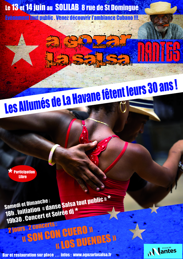 Herblain (44) 21h00>02h30 [+d'infos] dim 03 > Trélazé Salsa Festival : stages, concert et soirées salle Aragon au parc du Vissoir à Trélazé (44) [+d'infos] sam 09 > soirée Sabado D'Salsa au bar Little Barrel à Nantes (44) 20h00>01h00 dim 10 > Dimanche DJ's : stages et soirée à la MQ de Doulon à Nantes (44) 15h00>22h30 [+d'infos] mer 13 > Practica ouverte à tous salle Bonnaire à Nantes (44) 20h30>23h30 3€/5€ [+d'infos] ven 15 > Initiation et practica au BowlCenter à St Herblain (44) 20h00>00h30 [+d'infos] ven 22 > Sensations Latines : stage et soirée au 18e Amendement à La Chapelle/Erdre (44) 20h15>00h30 mer 27 > Practica ouverte à tous salle Bonnaire à Nantes (44) 20h30>23h30 3€/5€ [+d'infos] jeu 28 > Practica salsa cubana au Centre Culturel Breton Yezhou Ha Sevenadur à St Herblain (44) 21h30>23h00 dim 31 > Dimanche A Gozar au bar Berlin 1989 Républik à Nantes (44) 17h00>22h00