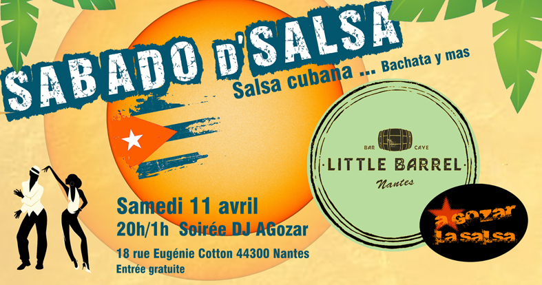 Herblain (44) 21h00>02h30 [+d'infos] dim 03 > Trélazé Salsa Festival : stages, concert et soirées salle Aragon au parc du Vissoir à Trélazé (44) [+d'infos] sam 09 > soirée Sabado D'Salsa au bar Little Barrel à Nantes (44) 20h00>01h00 dim 10 > Dimanche DJ's : stages et soirée à la MQ de Doulon à Nantes (44) 15h00>22h30 [+d'infos] mer 13 > Practica ouverte à tous salle Bonnaire à Nantes (44) 20h30>23h30 3€/5€ [+d'infos] ven 15 > Initiation et practica au BowlCenter à St Herblain (44) 20h00>00h30 [+d'infos] ven 22 > Sensations Latines : stage et soirée au 18e Amendement à La Chapelle/Erdre (44) 20h15>00h30 mer 27 > Practica ouverte à tous salle Bonnaire à Nantes (44) 20h30>23h30 3€/5€ [+d'infos] jeu 28 > Practica salsa cubana au Centre Culturel Breton Yezhou Ha Sevenadur à St Herblain (44) 21h30>23h00 dim 31 > Dimanche A Gozar au bar Berlin 1989 Républik à Nantes (44) 17h00>22h00